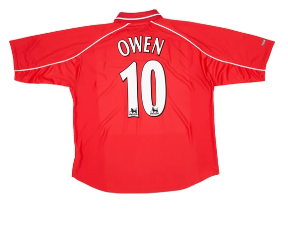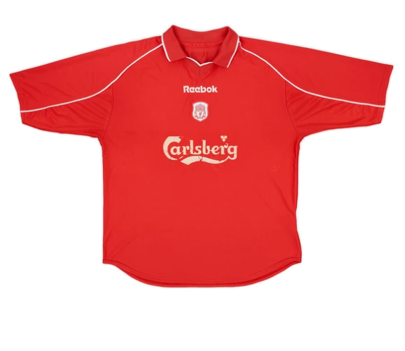 The Liverpool 2000-02 home kit, worn by Michael Owen with the iconic #10, was designed by Reebok and featured a classic red design with white collar accents. This kit is remembered for Owen's incredible performances, including his match-winning brace in the 2001 FA Cup final against Arsenal, which helped Liverpool secure a historic treble of the FA Cup, League Cup, and UEFA Cup. It remains a symbol of Owen's peak years at the club.
